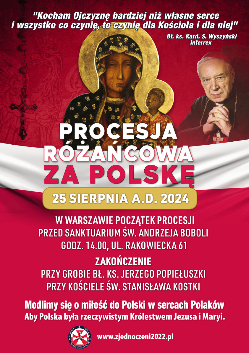 Zapraszamy do udziału w Pokutnych Procesjach Różańcowych w dniu 16 października 2022 r. Zachęcamy do wspólnej modlitwy i pokuty na ulicach stolicy Polski.