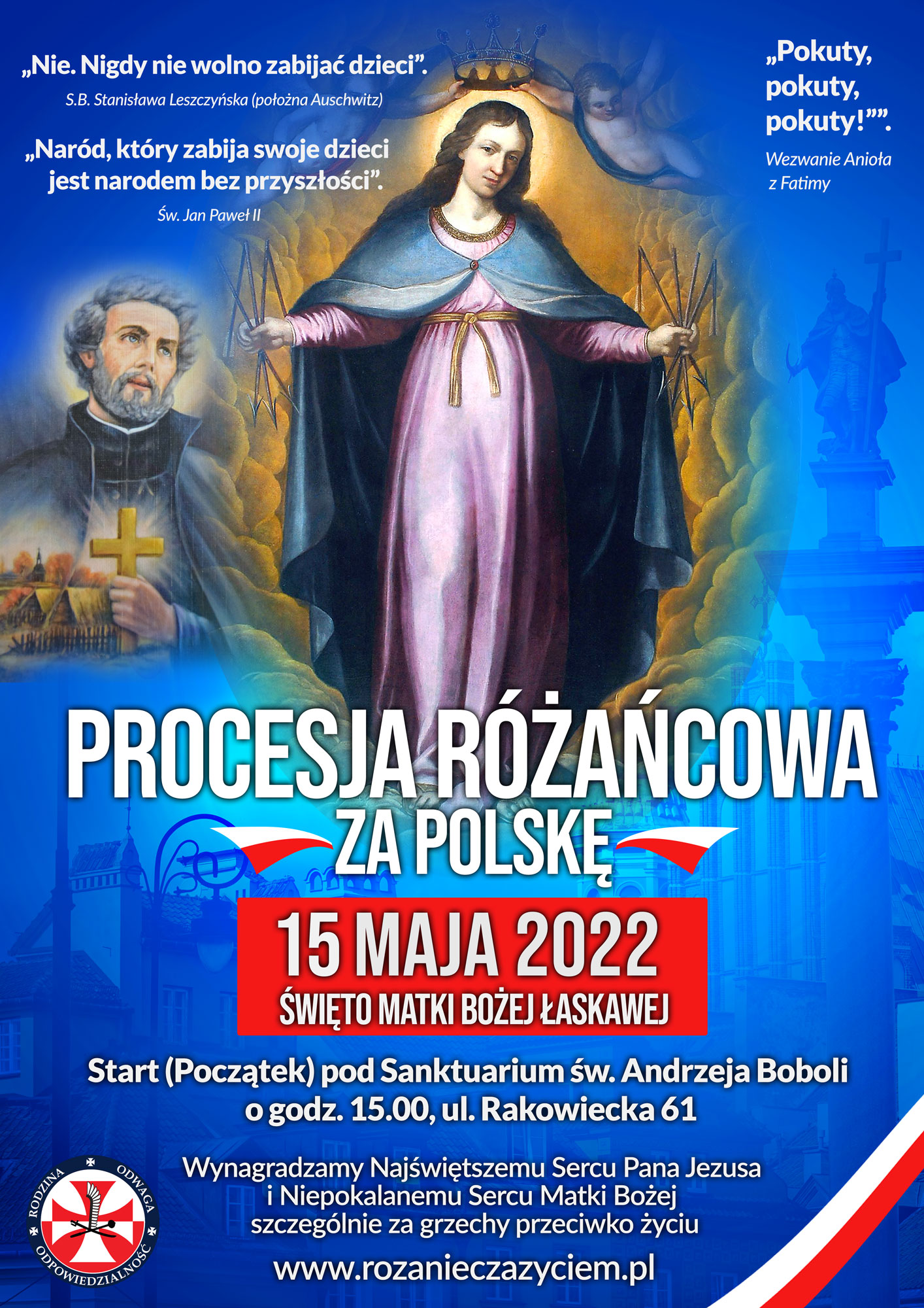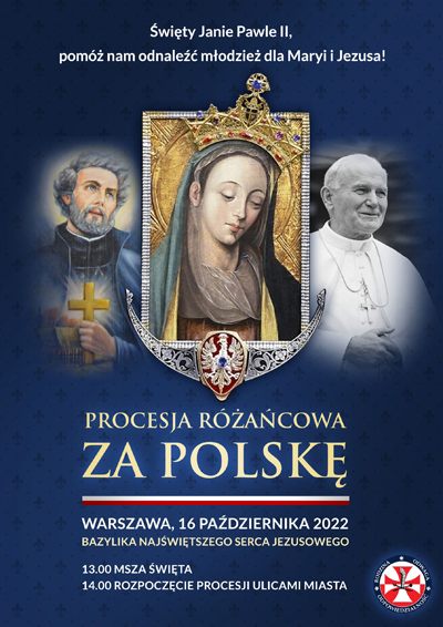 Zapraszamy do udziału w Pokutnych Procesjach Różańcowych w dniu 16 października 2022 r. Zachęcamy do wspólnej modlitwy i pokuty na ulicach stolicy Polski.